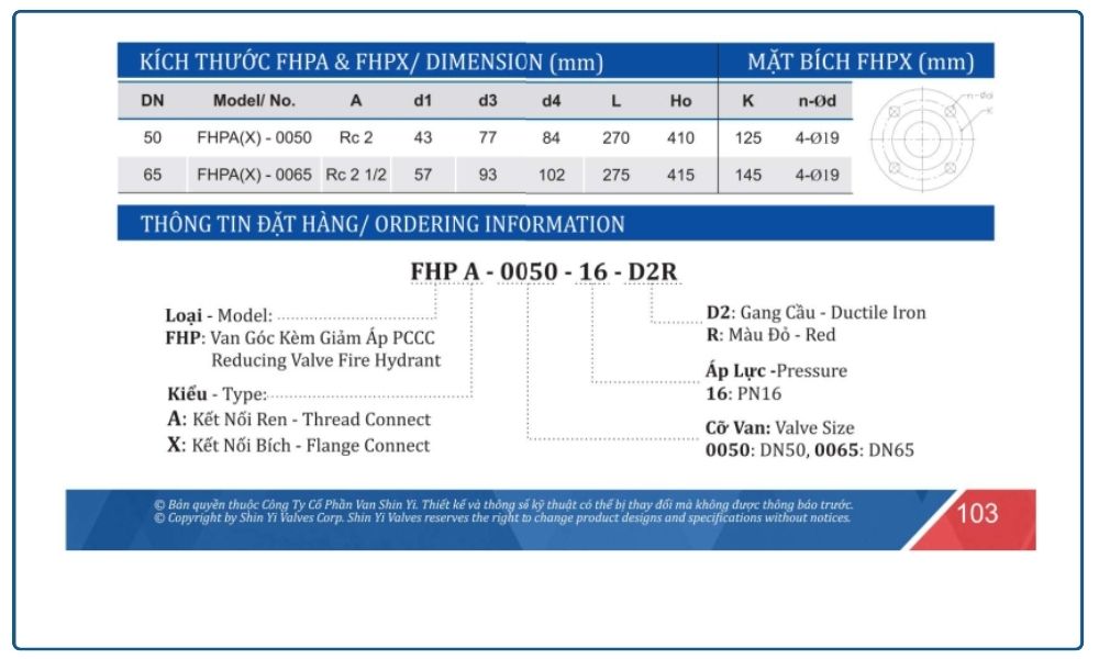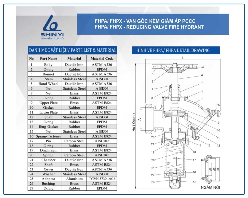 Thông số kỹ thuật van góc kèm giảm áp Shinyi